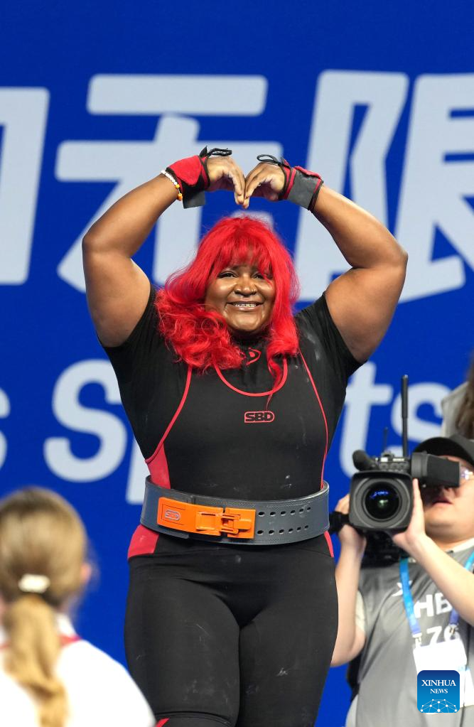 Sonita Kyen Muluh of Belgium reacts during the Women's Super Heavyweight Final of Powerlifting event at The World Games 2025 in Chengdu, southwest China's Sichuan Province, Aug. 15, 2025. (Xinhua/Xu Suhui)
