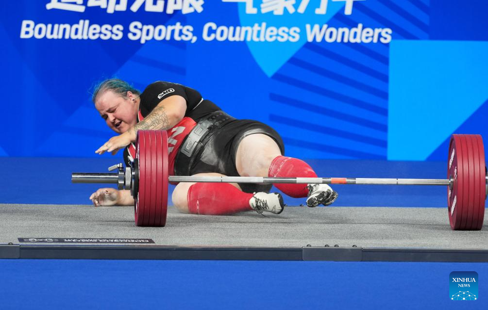 Brittany Dayle Schlater of Canada falls during the Women's Super Heavyweight Final of Powerlifting event at The World Games 2025 in Chengdu, southwest China's Sichuan Province, Aug. 15, 2025. (Xinhua/Xu Suhui)