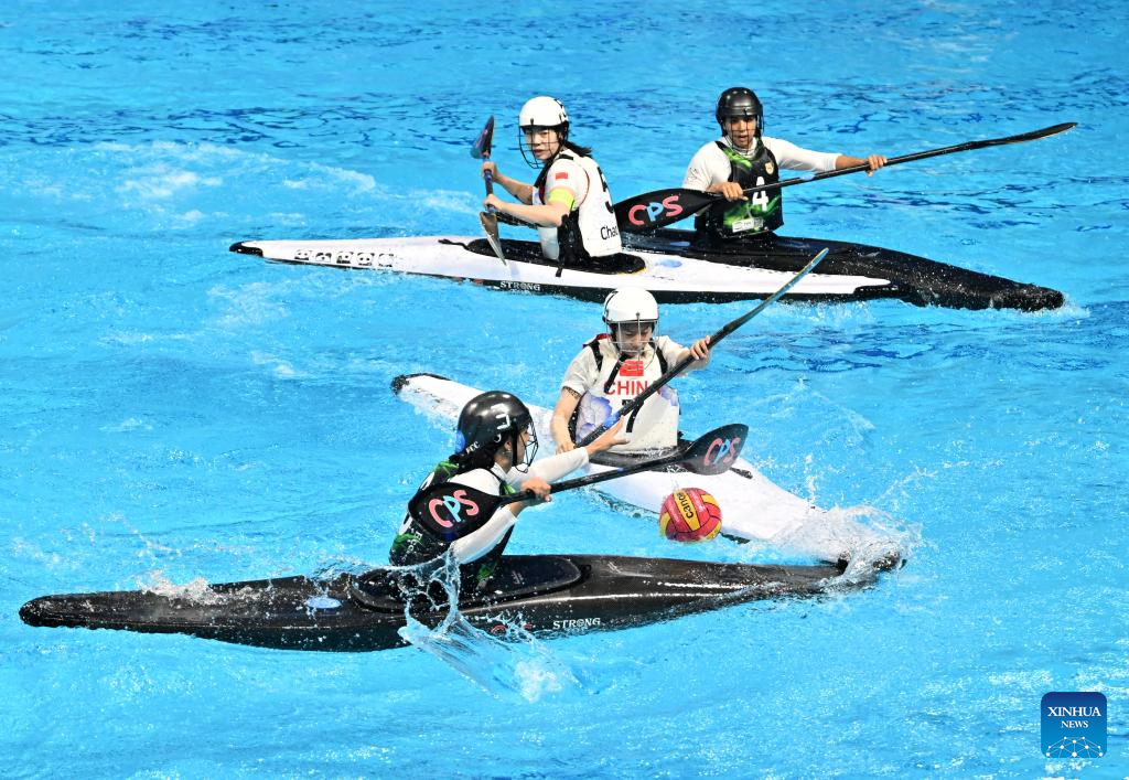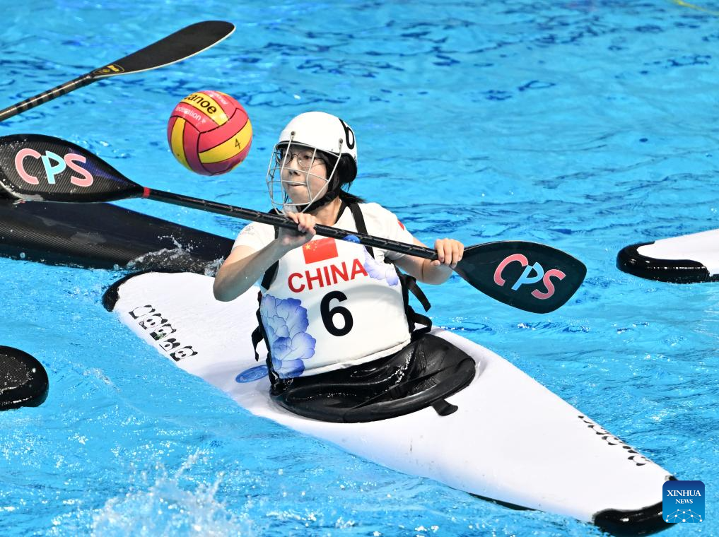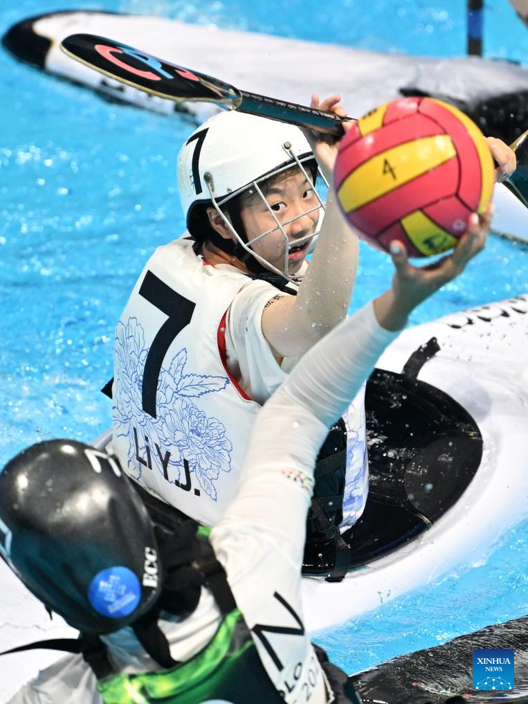Li Yijie of China competes during the Canoe Polo Women's Finals 7th Place Game between China and Iran at The World Games 2025 in Chengdu, southwest China's Sichuan Province, Aug. 16, 2025. (Xinhua/Li Jianan)