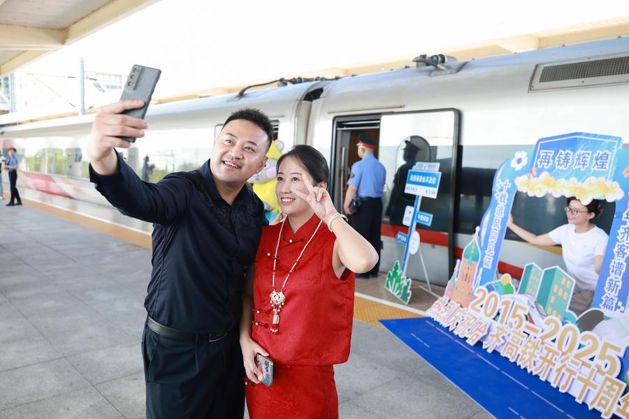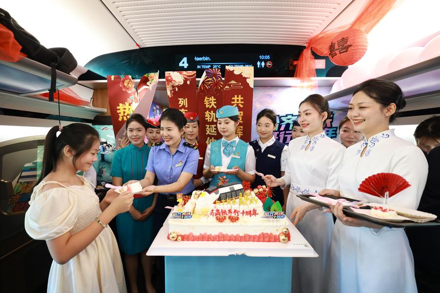 This drone photo taken on Aug. 17, 2025 shows a high-speed train running along the Harbin-Qiqihar railway. (Photo by Yuan Yong/Xinhua)Children pose for photos at Qiqihar South Railway Station in Qiqihar, northeast China's Heilongjiang Province, Aug. 17, 2025. (Photo by Xu Shuai/Xinhua)Railway crew members present a piece of cake to a girl to celebrate the 10th anniversary of the Harbin-Qiqihar railway of putting into operation on a train in northeast China's Heilongjiang Province, Aug. 17, 2025. (Photo by Xu Shuai/Xinhua)This drone photo taken on Aug. 17, 2025 shows a high-speed train running past Daqing East Railway Station along the Harbin-Qiqihar railway in northeast China's Heilongjiang Province. (Photo by Yuan Yong/Xinhua)This drone photo taken on Aug. 17, 2025 shows a high-speed train running along the Harbin-Qiqihar railway. (Photo by Yuan Yong/Xinhua)This drone photo taken on Aug. 17, 2025 shows a high-speed train running along the Harbin-Qiqihar railway. (Photo by Yuan Yong/Xinhua)A couple pose for photos at Qiqihar South Railway Station in Qiqihar, northeast China's Heilongjiang Province, Aug. 17, 2025. (Photo by Xu Shuai/Xinhua)■