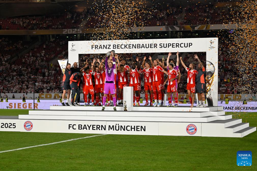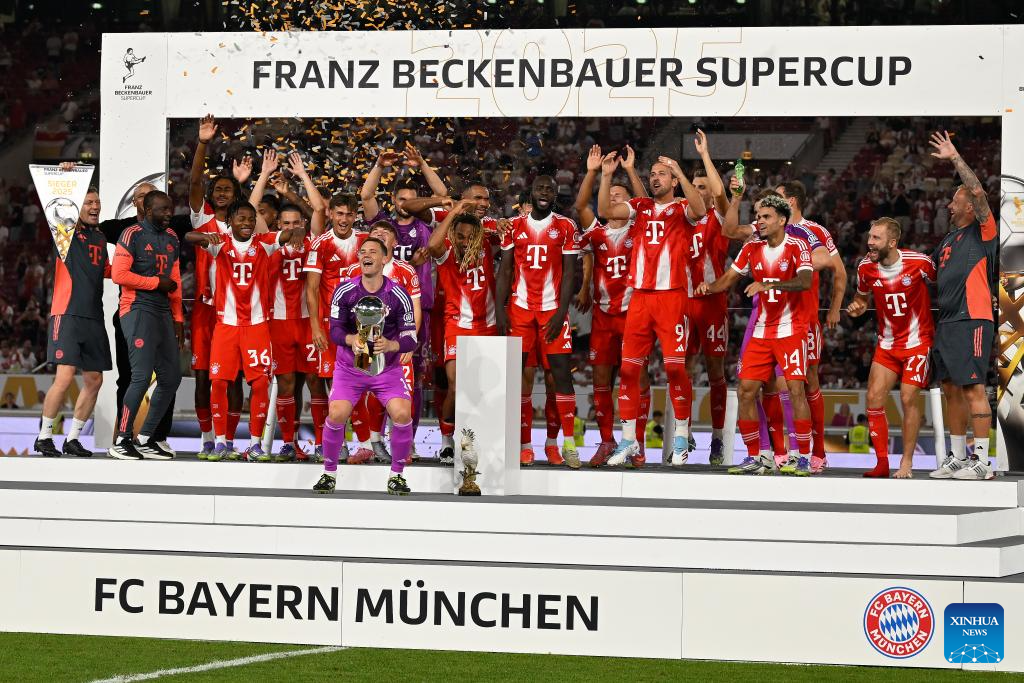 Team Bayern Munich celebrate during the awarding ceremony after the 2025 Franz Beckenbauer Supercup final match between Bayern Munich and VfB Stuttgart in Stuttgart, Germany, Aug. 16, 2025. (Photo by Ulrich Hufnagel/Xinhua)