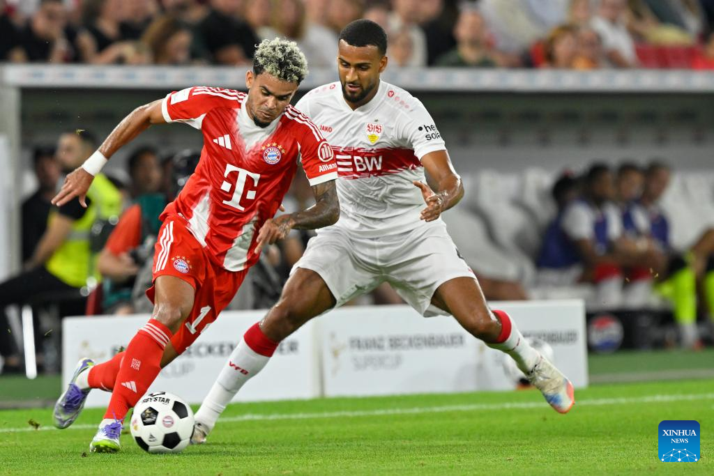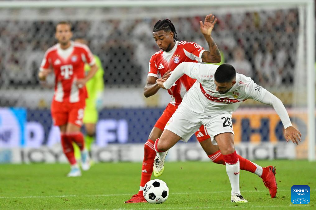 Luis Diaz (L) of Bayern Munich vies with Josha Vagnoman of VfB Stuttgart during the 2025 Franz Beckenbauer Supercup final match between Bayern Munich and VfB Stuttgart in Stuttgart, Germany, Aug. 16, 2025. (Photo by Ulrich Hufnagel/Xinhua)