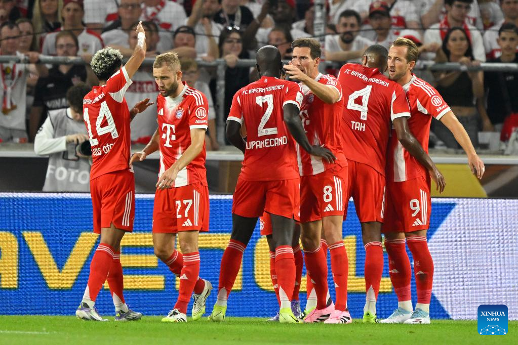 Harry Kane (1st R) of Bayern Munich celebrates scoring with teammates during the 2025 Franz Beckenbauer Supercup final match between Bayern Munich and VfB Stuttgart in Stuttgart, Germany, Aug. 16, 2025. (Photo by Ulrich Hufnagel/Xinhua)