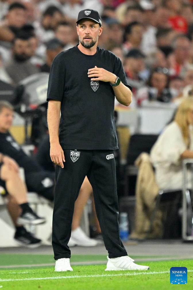 Sebastian Hoeness, head coach of VfB Stuttgart, is seen during the 2025 Franz Beckenbauer Supercup final match between Bayern Munich and VfB Stuttgart in Stuttgart, Germany, Aug. 16, 2025. (Photo by Ulrich Hufnagel/Xinhua)