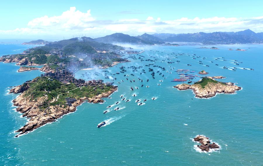 An aerial drone photo taken on Aug. 16, 2025 shows fishing boats sailing from a fishing port after the end of a seasonal fishing ban in Lianjiang County of Fuzhou, southeast China's Fujian Province. (Photo by Wang Wangwang/Xinhua)Latvian students practice Tai Chi sword at Chenjiagou Village of Wenxian County in Jiaozuo City, central China's Henan Province, Aug. 16, 2025. Twenty-nine students from Latvia are here on a 15-day program to study Tai Chi and experience the charm of Chinese martial arts. (Photo by Xu Hongxing/Xinhua)Players of Germany celebrate during the Ultimate Flying Disc Mixed Finals Bronze Medal Game between Germany and France at the World Games 2025 in Chengdu, southwest China's Sichuan Province, Aug. 16, 2025. (Xinhua/Sun Fanyue)Buckingham Palace is lit up to mark the 80th anniversary of Britain's Victory over Japan (VJ) Day, in London, Britain, Aug. 15, 2025. As Friday marks the 80th anniversary of Britain's Victory over Japan (VJ) Day, the kingdom commemorated the occasion with a series of events. From 9 p.m. on Friday evening, hundreds of buildings and sites were illuminated to mark the day, including Buckingham Palace, 10 Downing Street, the Houses of Parliament, the Tower of London, and the White Cliffs of Dover. (Photo by Ray Tang/Xinhua)A traveler walks past striking Air Canada flight attendants at Vancouver International Airport in Richmond, British Columbia, Canada, Aug. 16, 2025. Canada's largest airline Air Canada said Saturday it has suspended all operations of Air Canada and Air Canada Rouge due to a strike by its 10,000 flight attendants. Approximately 130,000 customers will be impacted each day that the strike continues, the airline said. (Photo by Liang Sen/Xinhua)Italian Carabinieri, known as the gendarmerie of Italy, perform before the traditional Italian horse race "Palio di Siena" in Siena, Italy, Aug. 16, 2025. (Photo by Alberto Lingria/Xinhua)Devotees line up to worship Lord Krishna during the Krishna Janmashtami festival in Lalitpur, Nepal, Aug. 16, 2025. (Photo by Hari Maharjan/Xinhua)■