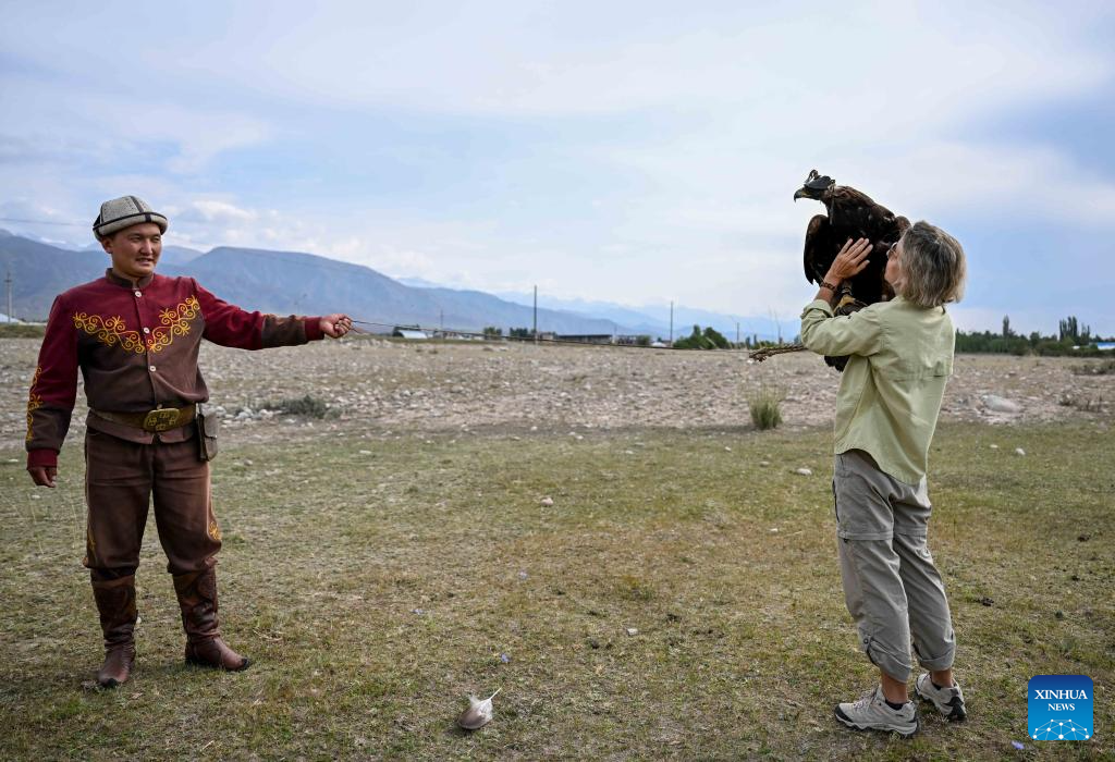 A foreign visitor experiences raptor training near Cholpon-Ata, Kyrgyzstan, on Aug. 16, 2025.