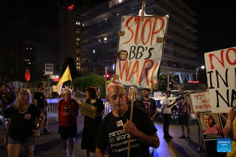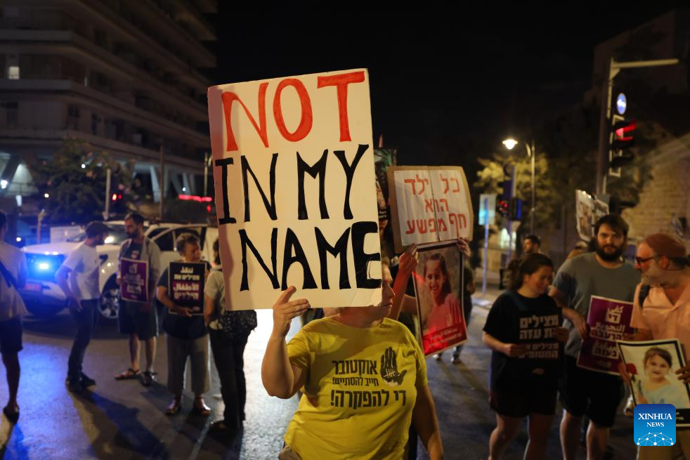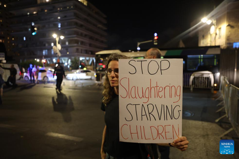 People gathered in the evening to protest against the Israeli military's "starvation policy" in Gaza and urged the Israeli government to swiftly end the Gaza war. (Photo by Jamal Awad/Xinhua)