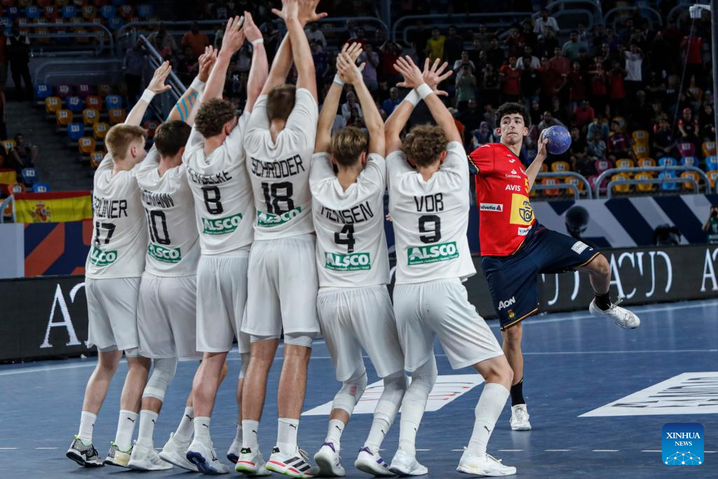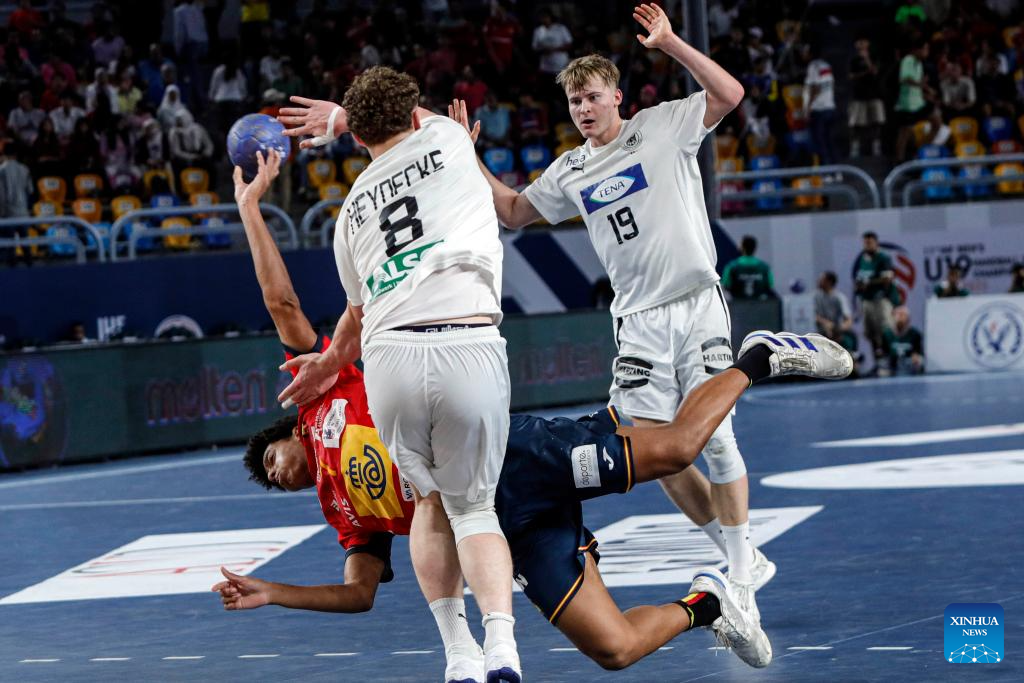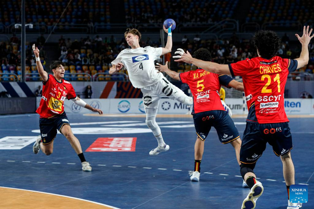 Marcos Fis Ballester (C) of Spain competes during the final between Spain and Germany at the 11th IHF Men's Youth World Championship 2025 in Cairo, Egypt, Aug. 17, 2025. (Xinhua/Ahmed Gomaa)