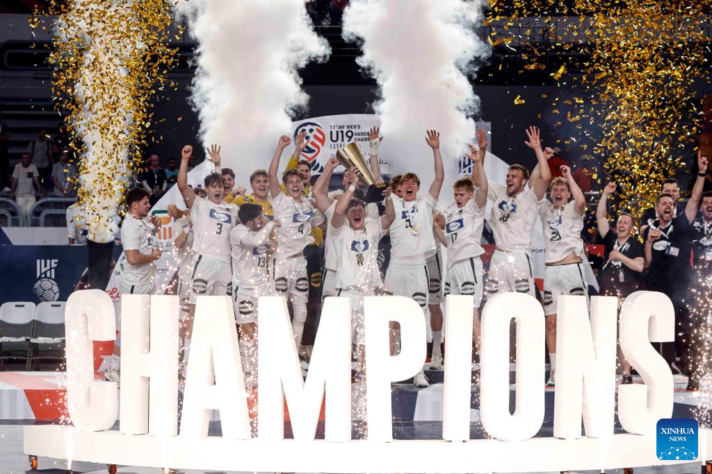 Players of Germany celebrate during the awarding ceremony after winning the final between Spain and Germany at the 11th IHF Men's Youth World Championship 2025 in Cairo, Egypt, Aug. 17, 2025. (Xinhua/Ahmed Gomaa)