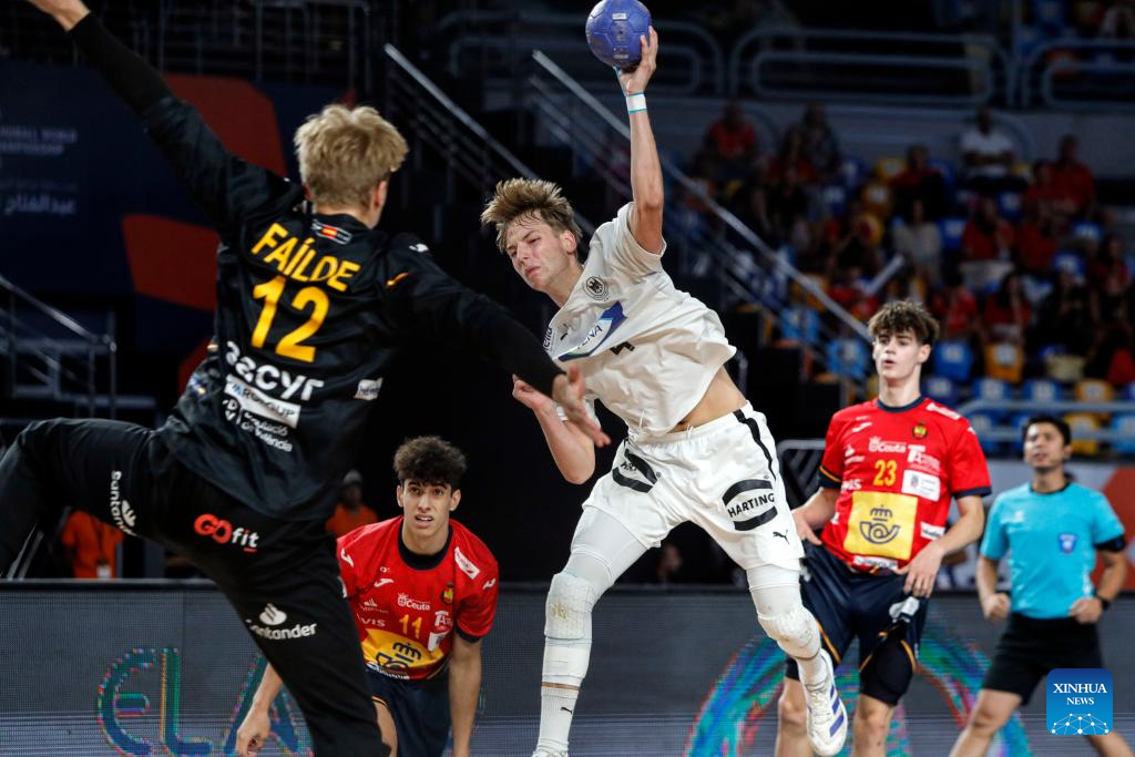 Noah Hensen (2nd L) of Germany shoots during the final between Spain and Germany at the 11th IHF Men's Youth World Championship 2025 in Cairo, Egypt, Aug. 17, 2025. (Xinhua/Ahmed Gomaa)