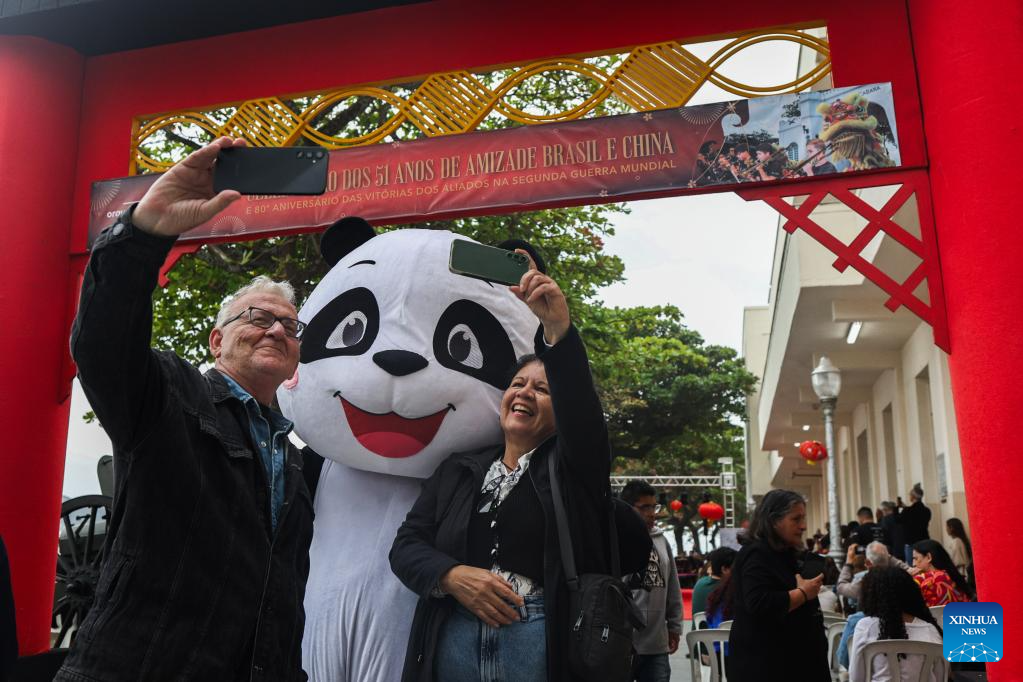 A couple poses for photos with a panda mascot during a celebration marking the 51st anniversary of China-Brazil diplomatic relations and the 80th anniversary of the victory in World War II, at Forte Copacabana in Rio de Janeiro, Brazil, Aug. 16, 2025. (Photo by Claudia Martini/Xinhua)