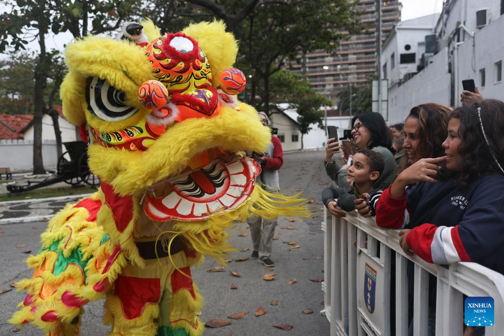 A lion dance is staged during a celebration marking the 51st anniversary of China-Brazil diplomatic relations and the 80th anniversary of the victory in World War II, at Forte Copacabana in Rio de Janeiro, Brazil, Aug. 16, 2025. (Photo by Claudia Martini/Xinhua)