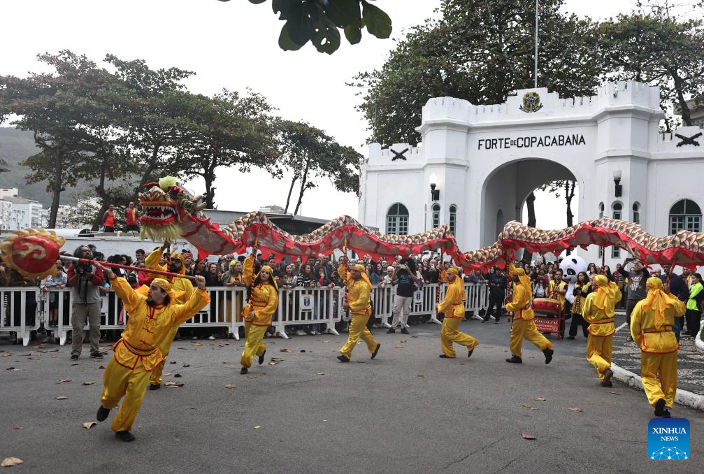 A dragon dance is staged during a celebration marking the 51st anniversary of China-Brazil diplomatic relations and the 80th anniversary of the victory in World War II, at Forte Copacabana in Rio de Janeiro, Brazil, Aug. 16, 2025. (Photo by Claudia Martini/Xinhua)