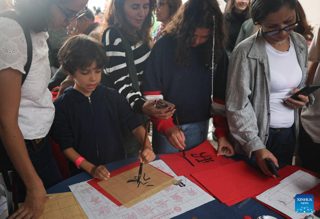 People try Chinese calligraphy during a celebration marking the 51st anniversary of China-Brazil diplomatic relations and the 80th anniversary of the victory in World War II, at Forte Copacabana in Rio de Janeiro, Brazil, Aug. 16, 2025. (Photo by Claudia Martini/Xinhua)