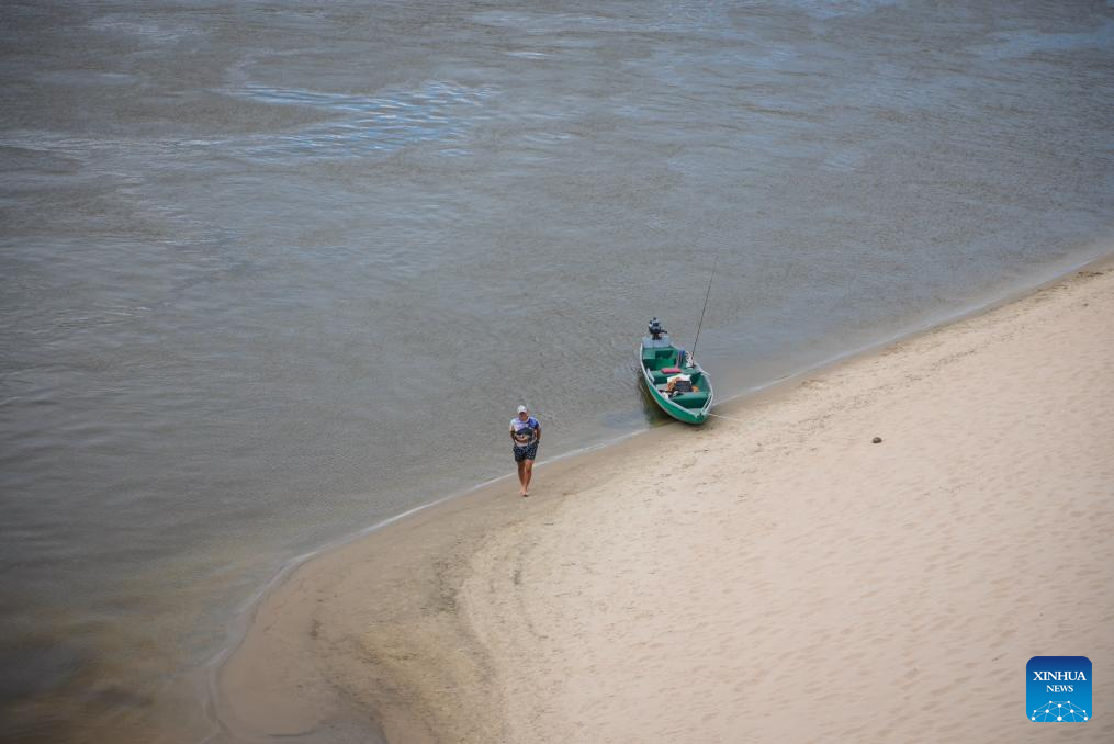 A resident is pictured at an exposed sandbank in the Vistula River in Warsaw, Poland, Aug. 17, 2025. Due to ongoing drought, the water level of the Vistula River has decreased, with exposed riverbeds visible in many sections across the city. (Photo by Jaap Arriens/Xinhua)