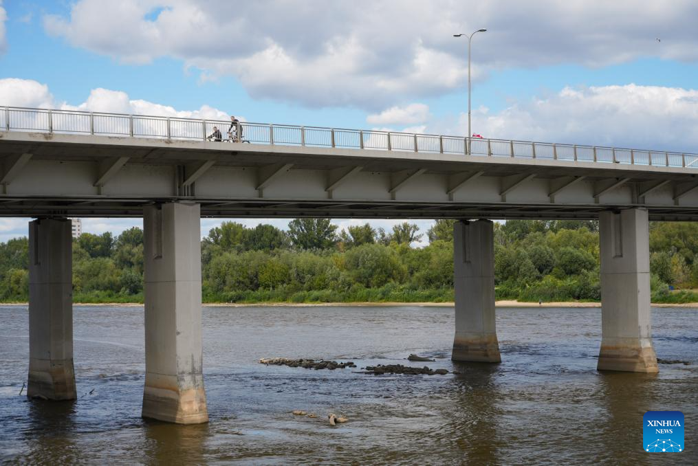 This photo taken on Aug. 17, 2025 shows exposed riverbeds of the Vistula River under a bridge in Warsaw, Poland. Due to ongoing drought, the water level of the Vistula River has decreased, with exposed riverbeds visible in many sections across the city. (Photo by Jaap Arriens/Xinhua)