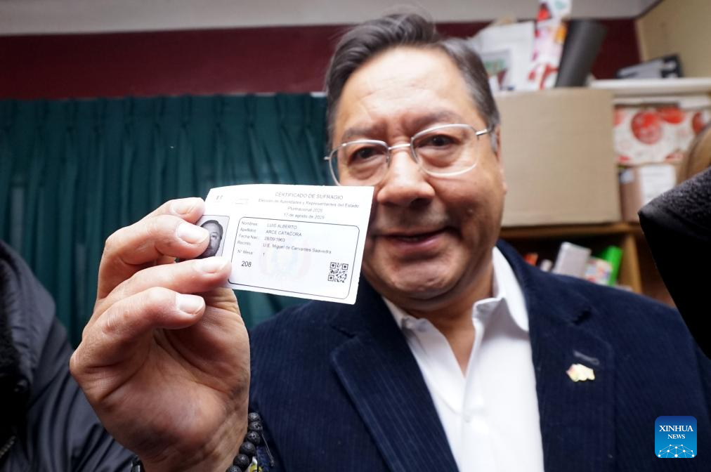Bolivian President Luis Arce shows his ballot at a polling station in La Paz, Bolivia, Aug. 17, 2025.