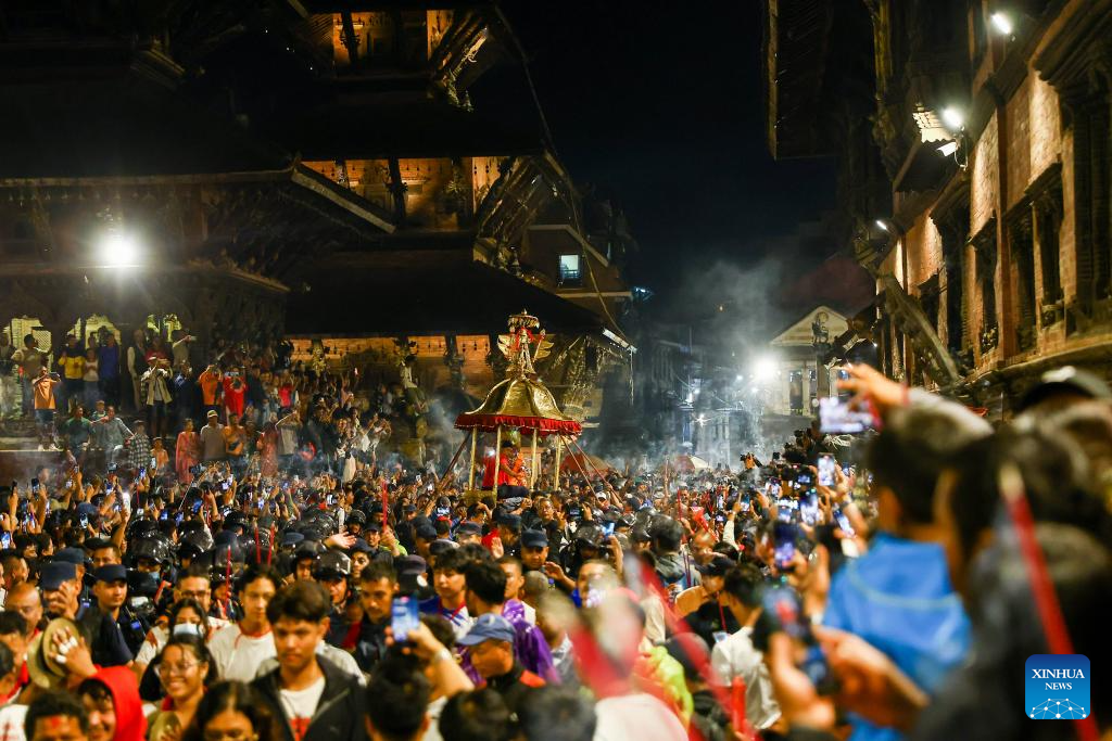 Devotees carry the chariot of Lord Bhimsen during the Bhimsen Jatra festival at Patan Durbar Square in Lalitpur, Nepal, Aug. 17, 2025. Bhimsen is the deity for the welfare of business and is specially paid homage by the businessmen of the Newar community. (Photo by Sulav Shrestha/Xinhua)