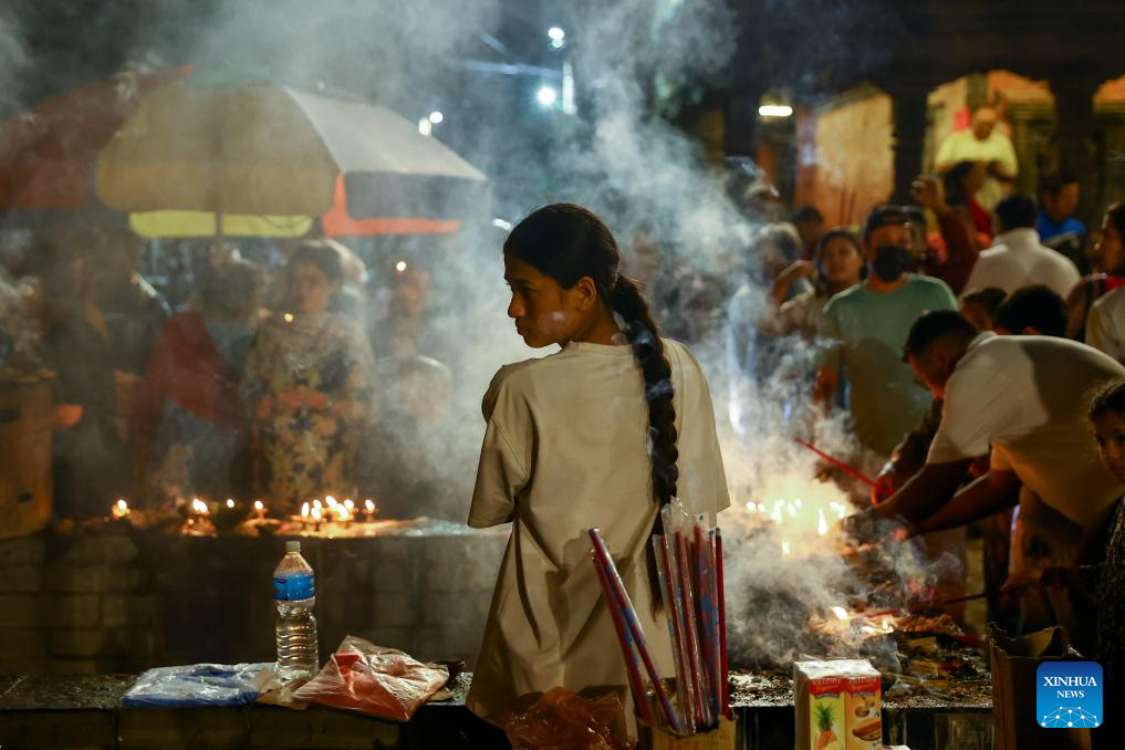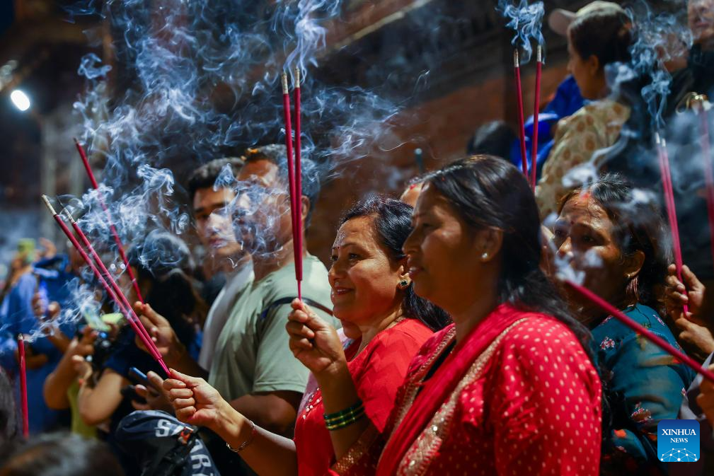 Devotees burn incense sticks during the Bhimsen Jatra festival at Patan Durbar Square in Lalitpur, Nepal, Aug. 17, 2025. Bhimsen is the deity for the welfare of business and is specially paid homage by the businessmen of the Newar community. (Photo by Sulav Shrestha/Xinhua)