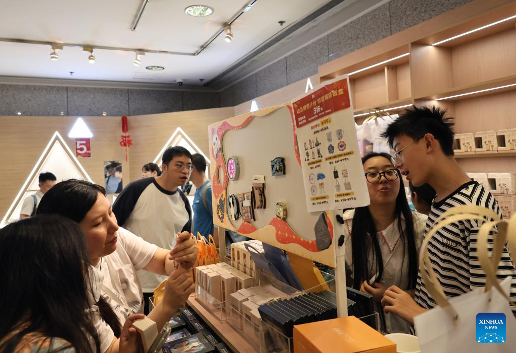 Visitors select cultural and creative products at Shanghai Museum in Shanghai, east China, Aug. 17, 2025. The exhibition titled "On Top of the Pyramid: The Civilization of Ancient Egypt", which had lasted for 13 months at Shanghai Museum since July 19, 2024, closed on Sunday here, receiving over 2.77 million visitors. (Xinhua/Fang Zhe)