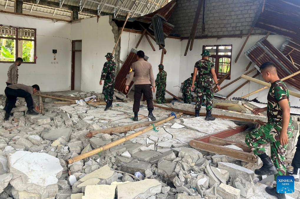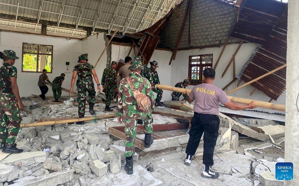 Indonesian soldiers and police officers clean a damaged building after a 6.0-magnitude earthquake in Poso Regency, Central Sulawesi, Indonesia, on Aug. 18, 2025. A 6.0-magnitude earthquake struck Poso Regency in Central Sulawesi Province, Indonesia, early Sunday, injuring at least 29 people, the country's National Disaster Management Agency (BNPB) said in a statement. (Photo by Rian Darmawan/Xinhua)