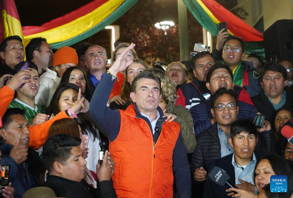 Bolivian presidential candidate Rodrigo Paz Pereira (front) speaks to his supporters in La Paz, Bolivia, Aug. 17, 2025. Bolivia's Supreme Electoral Tribunal announced Sunday that the country's presidential election will go to a runoff after no candidate secured the required majority in the first round. The preliminary results, published on the court's official website, showed Rodrigo Paz Pereira, the candidate of the Christian Democratic Party, and Jorge Quiroga, the former president and candidate of Alianza Libre coalition, ranked first and second among the eight candidates, with approximately 32.1 percent and 26.8 percent of the votes, respectively. (Photo by Javier Mamani/Xinhua)