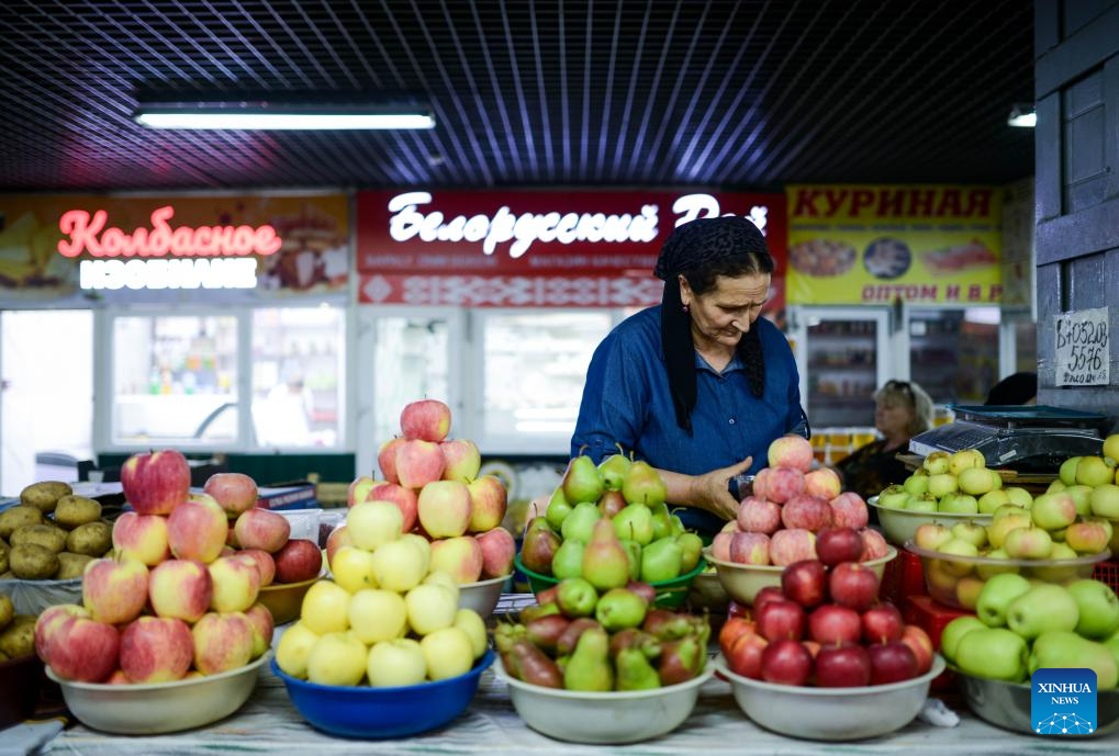 A fruit vendor organizes her stall at a market in downtown Almaty, Kazakhstan, on Aug. 17, 2025.