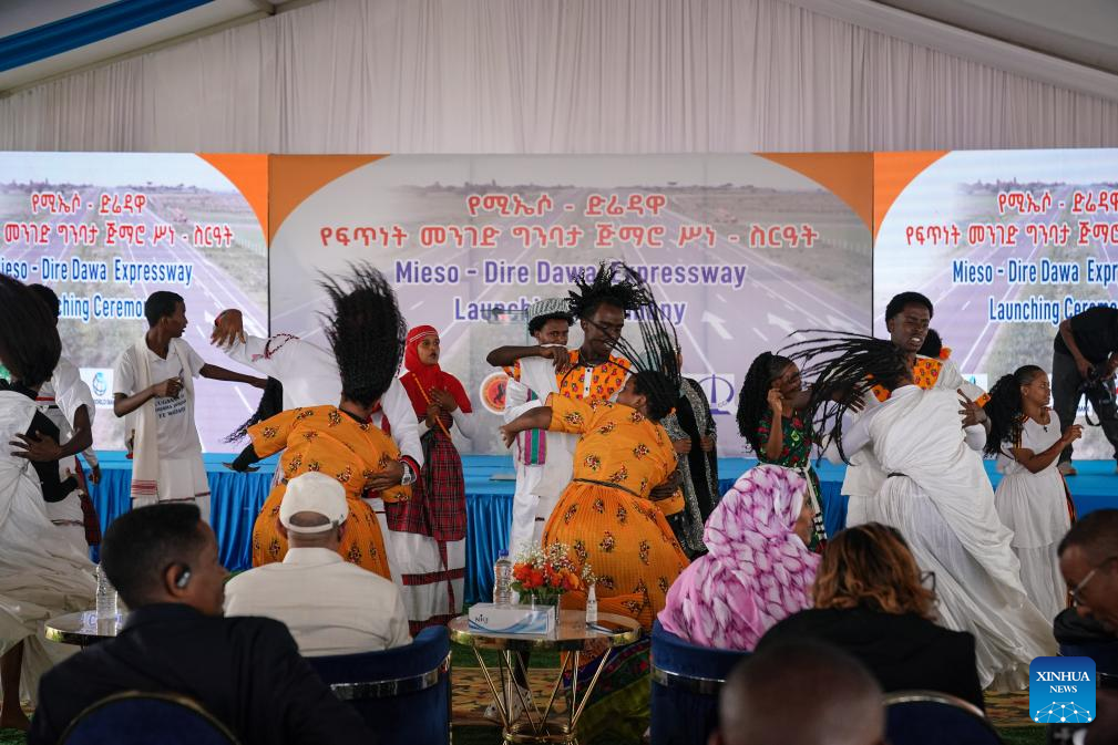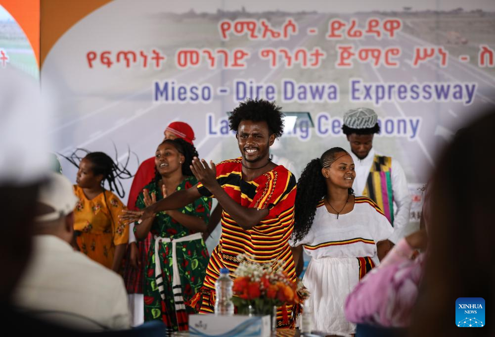 Dancers perform during the launching ceremony of the construction of the Mieso-Dire Dawa Expressway, in Dire Dawa, eastern Ethiopia, on Aug. 19, 2025. The construction of the Mieso-Dire Dawa Expressway, a major infrastructure project within the Ethio-Djibouti Transport Corridor, was launched on Tuesday. (Xinhua/Han Xu)