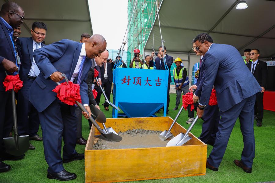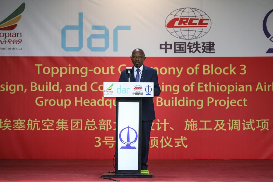 The topping-out ceremony of the 45-meter-high structure was held on Monday, attended by representatives from the Ethiopian Airlines Group and China Civil Engineering Construction Corporation (CCECC).