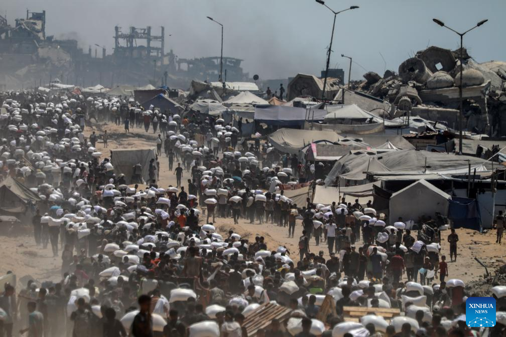 (250819) -- GAZA, Aug. 19, 2025 (Xinhua) -- Palestinians fetch humanitarian aid that entered Gaza through a border crossing, in Beit Lahia, northern Gaza Strip, on July 27, 2025.
