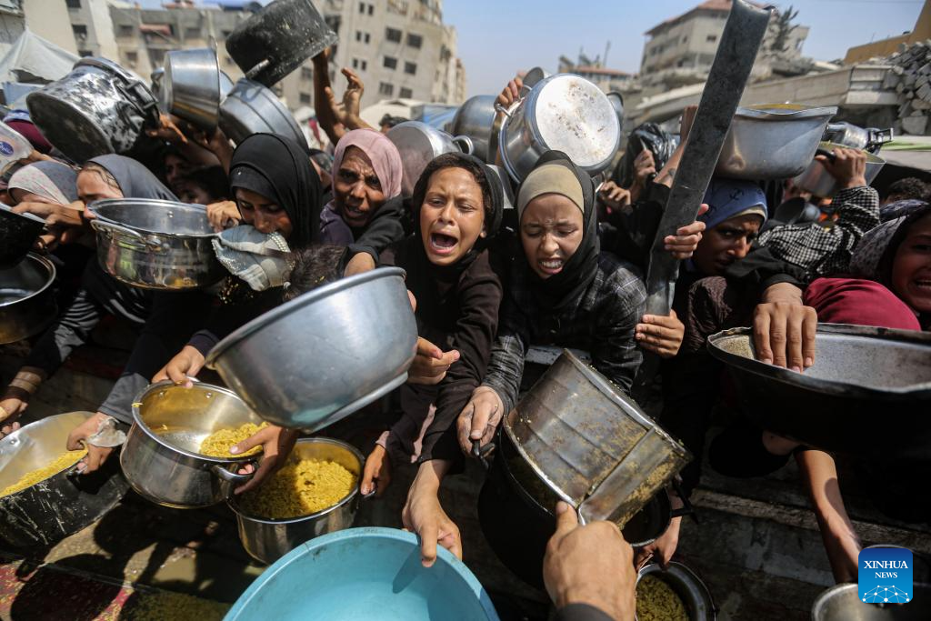 (250819) -- GAZA, Aug. 19, 2025 (Xinhua) -- Displaced Palestinians receive free food in Gaza City on Aug. 10, 2025.