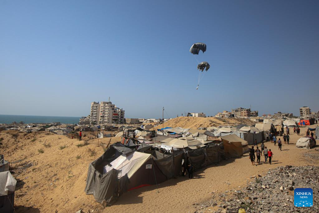 (250819) -- GAZA, Aug. 19, 2025 (Xinhua) -- This photo shows an airdrop of aid to Gaza City on Aug. 15, 2025.