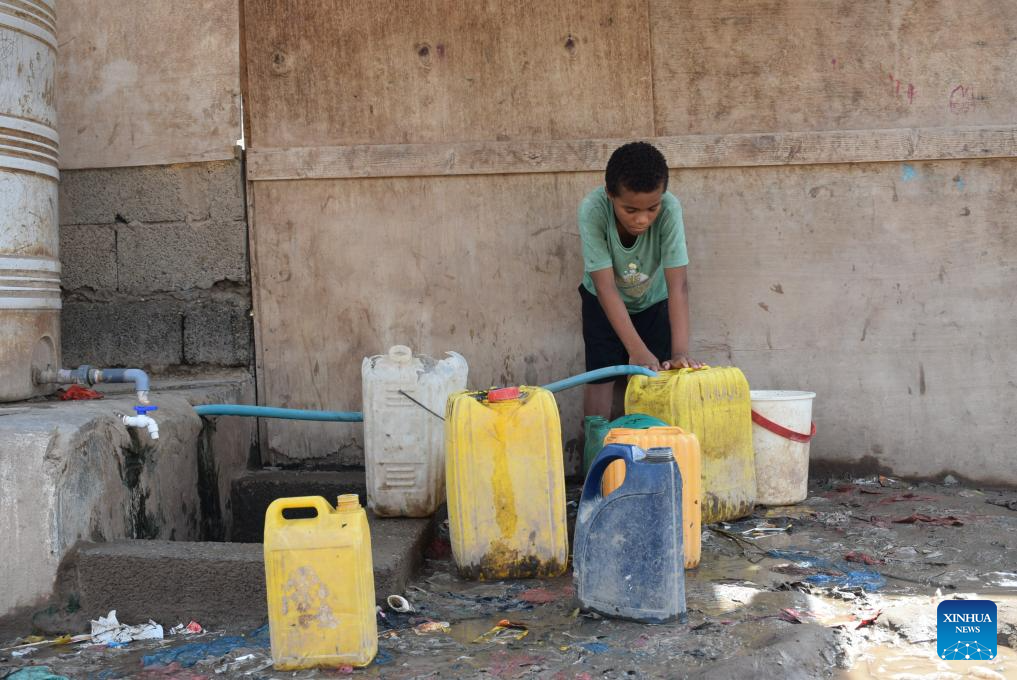 A displaced boy fills plastic containers with drinking water at a temporary displacement camp on the outskirts of Aden, Yemen, Aug. 11, 2025.