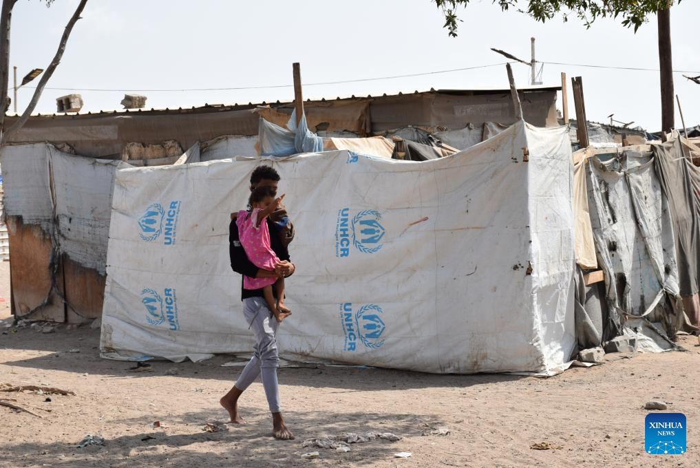 A displaced man holding his child walks beside tents at a temporary displacement camp on the outskirts of Aden, Yemen, Aug. 11, 2025. As the World Humanitarian Day is marked across countries on Tuesday, the Middle East and North Africa remain mired in some of the world's gravest crises, especially humanitarian ones. Across Gaza, Sudan, Syria, Lebanon and Yemen, armed conflict rages on amid hunger, diseases and collapsing water systems. The daily struggles to survive, of finding food, getting medicine or drawing water, now carry the risk of death. The pattern is consistent: Where war persists, hunger and disease follow. Humanitarian relief supplies may slow the pace, but without the political will to end the fighting, such critical aid falls drastically short. (Photo by Murad/Xinhua)
