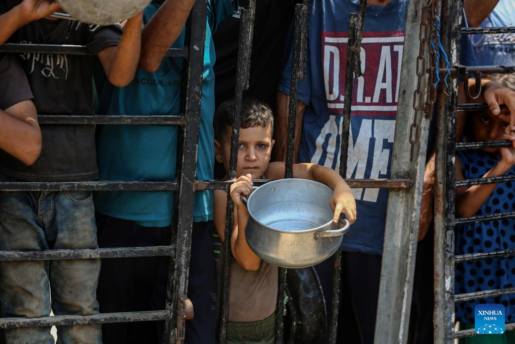 (250819) -- GAZA, Aug. 19, 2025 (Xinhua) -- Displaced Palestinians wait to receive free food in the west of Gaza City on Aug. 10, 2025.