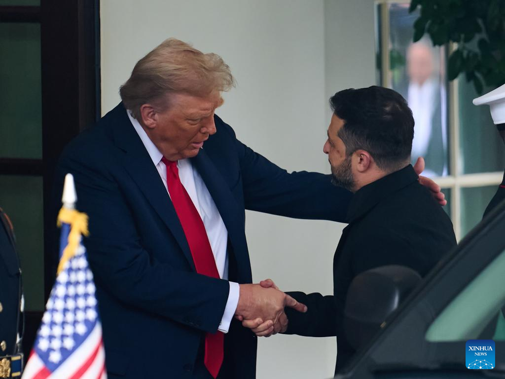 U.S. President Donald Trump (L) welcomes Ukrainian President Volodymyr Zelensky at the White House in Washington, D.C., the United States, on Aug. 18, 2025. Ukrainian President Volodymyr Zelensky arrived at the White House and began a bilateral meeting with U.S. President Donald Trump on Monday. (Xinhua/Hu Yousong)