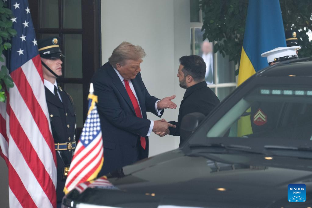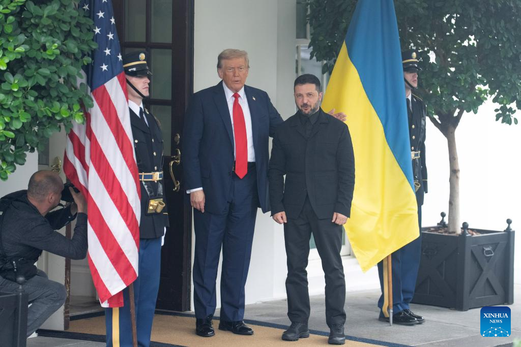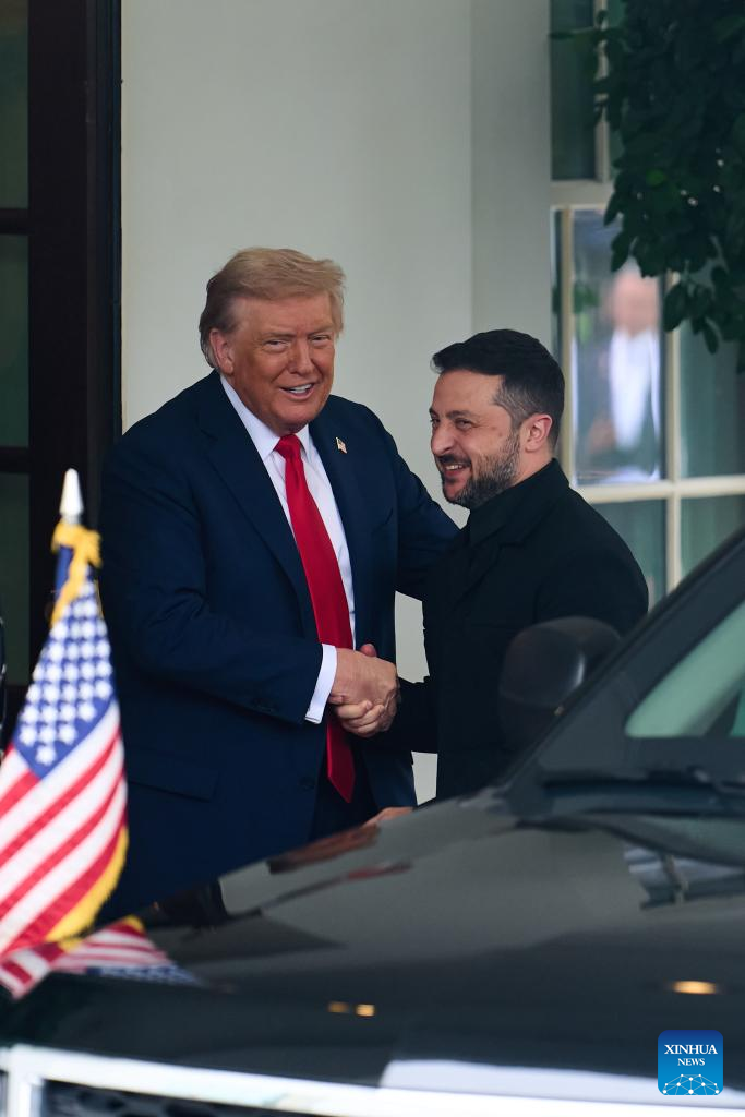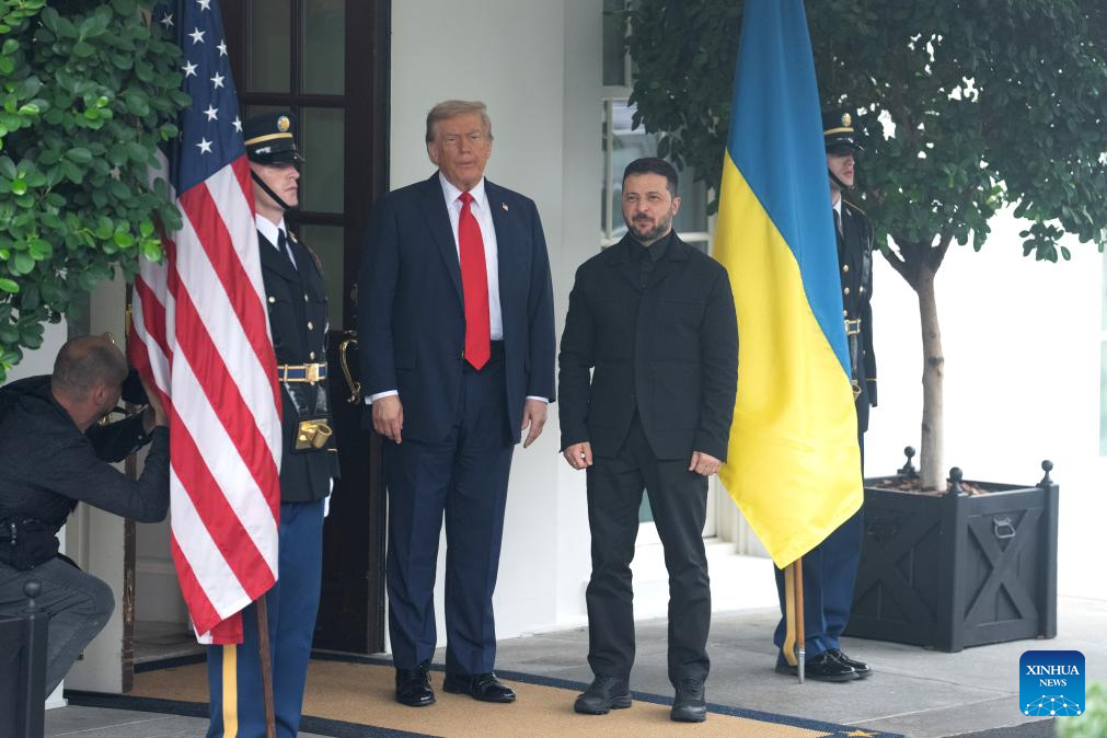 U.S. President Donald Trump (C) welcomes Ukrainian President Volodymyr Zelensky (R) at the White House in Washington, D.C., the United States, on Aug. 18, 2025. Ukrainian President Volodymyr Zelensky arrived at the White House and began a bilateral meeting with U.S. President Donald Trump on Monday. (Xinhua/Hu Yousong)