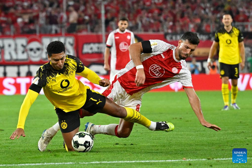 Klaus Gjasula (R) of Rot-Weiss Essen vies with Jobe Bellingham of Borussia Dortmund during the German Cup football 1st round match between Rot-Weiss Essen and Borussia Dortmund in Essen, Germany, Aug. 18, 2025. (Photo by Ulrich Hufnagel/Xinhua)