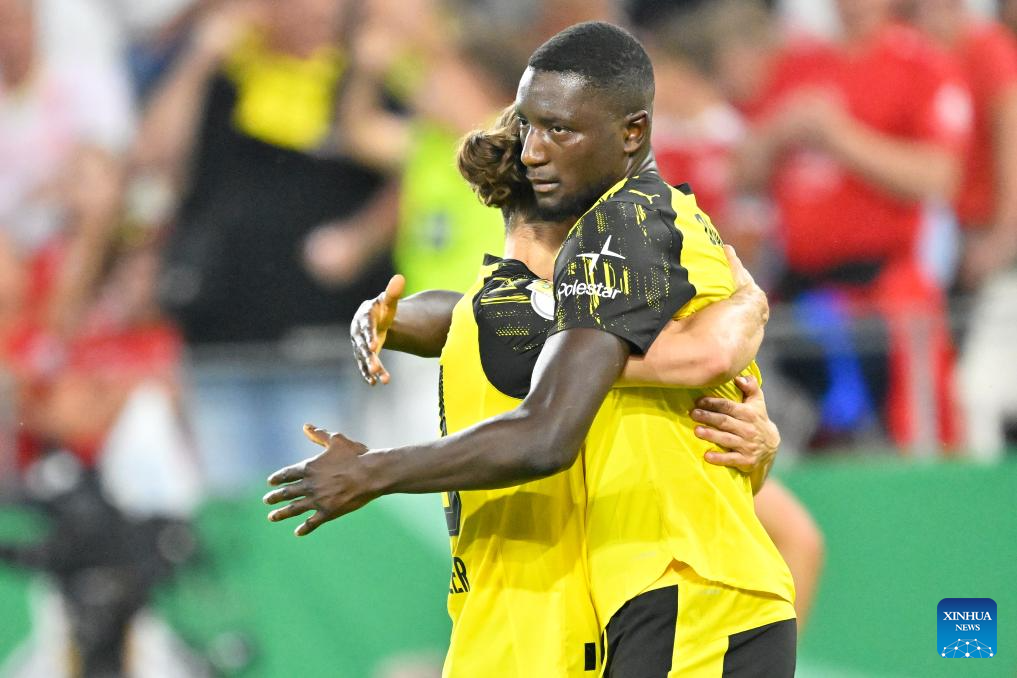 Serhou Guirassy (R) of Borussia Dortmund celebrates scoring with teammate Marcel Sabitzer during the German Cup football 1st round match between Rot-Weiss Essen and Borussia Dortmund in Essen, Germany, Aug. 18, 2025. (Photo by Ulrich Hufnagel/Xinhua)