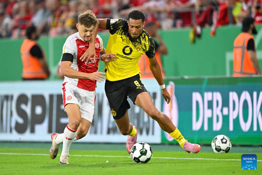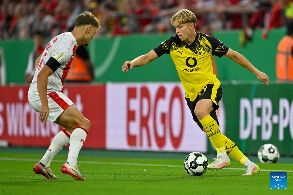 Jannik Hofmann (L) of Rot-Weiss Essen vies with Felix Nmecha of Borussia Dortmund during the German Cup football 1st round match between Rot-Weiss Essen and Borussia Dortmund in Essen, Germany, Aug. 18, 2025. (Photo by Ulrich Hufnagel/Xinhua)