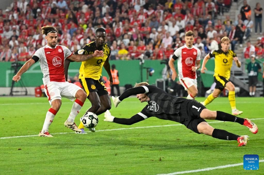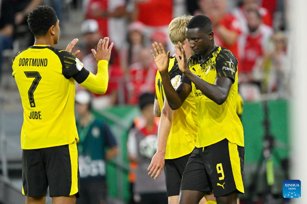 Serhou Guirassy (R) of Borussia Dortmund celebrates scoring with teammates during the German Cup football 1st round match between Rot-Weiss Essen and Borussia Dortmund in Essen, Germany, Aug. 18, 2025. (Photo by Ulrich Hufnagel/Xinhua)