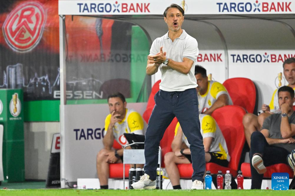 Niko Kovac, head coach of Borussia Dortmund, instructs during the German Cup football 1st round match between Rot-Weiss Essen and Borussia Dortmund in Essen, Germany, Aug. 18, 2025. (Photo by Ulrich Hufnagel/Xinhua)