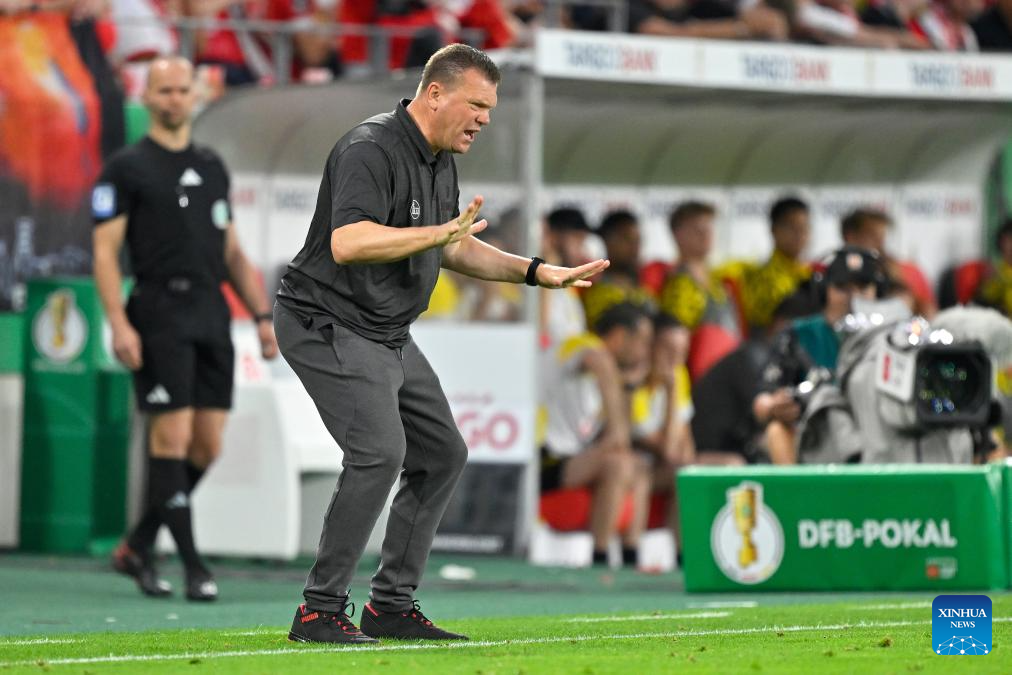 Uwe Koschinat, head coach of Rot-Weiss Essen, instructs during the German Cup football 1st round match between Rot-Weiss Essen and Borussia Dortmund in Essen, Germany, Aug. 18, 2025. (Photo by Ulrich Hufnagel/Xinhua)