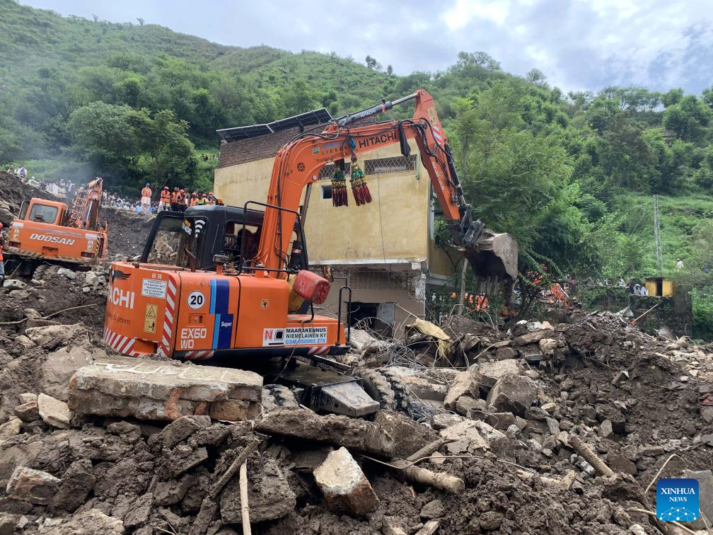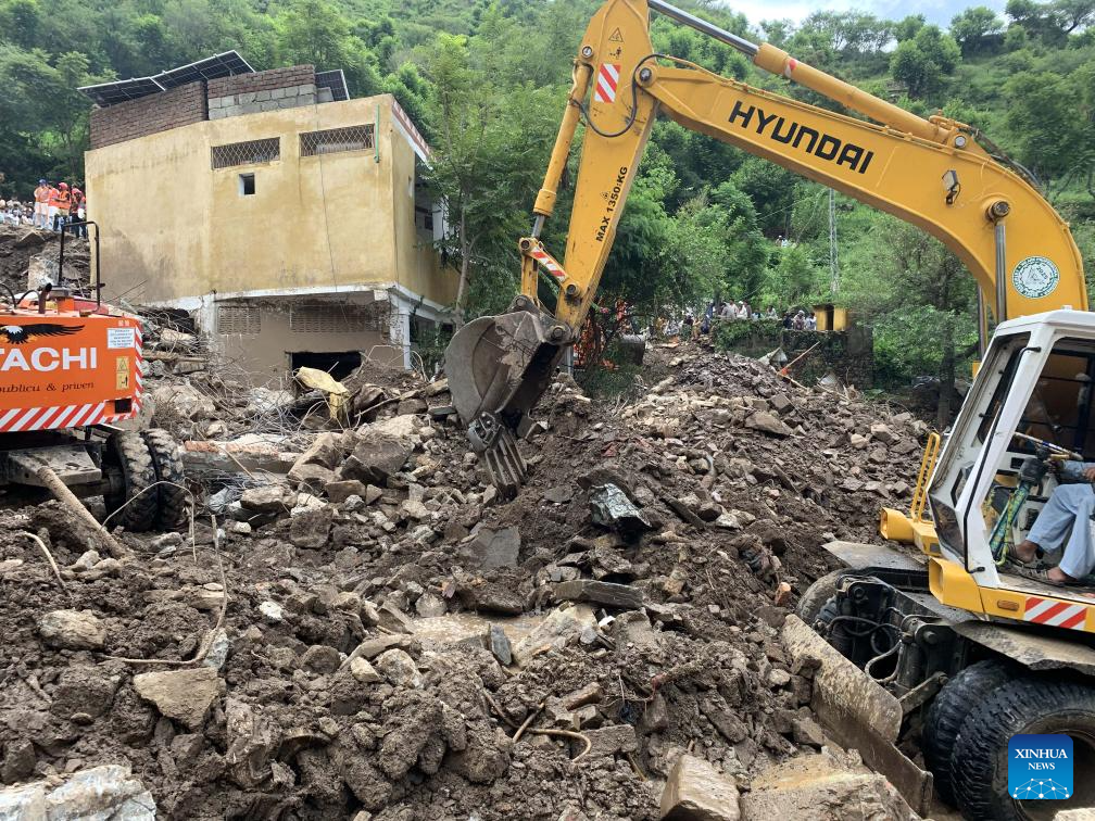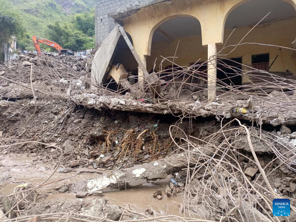 A damaged house is seen a day after a cloudburst in Swabi district of northwest Pakistan's Khyber Pakhtunkhwa province on Aug. 19, 2025. A total of 46 people have been killed in monsoon rains during the last 24 hours, raising the death toll of rain-related deaths to 393 in Pakistan since Thursday, the country's National Disaster Management Authority (NDMA) said on Tuesday. In total, 706 Pakistanis have died since the onset of the monsoon season on June 26, the authority said in its latest situation report. (Str/Xinhua)