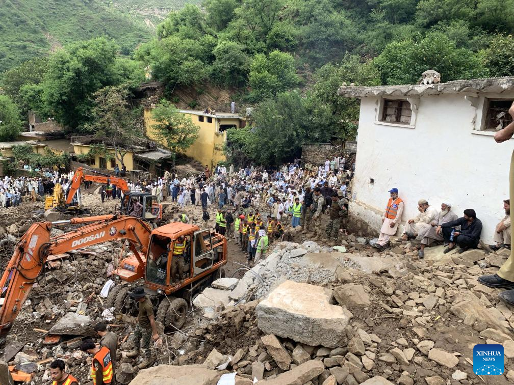 Residents watch as relief personnel search through the rubble of collapsed houses for victims during a rescue operation, a day after a cloudburst in Swabi district of northwest Pakistan's Khyber Pakhtunkhwa province on Aug. 19, 2025.