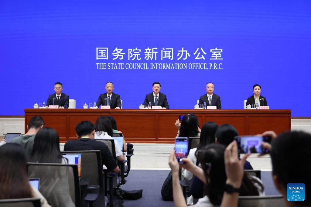 A press conference on China's achievements in building a leading country in sport during the 14th Five-Year Plan period (2021-2025) is held by the State Council Information Office (SCIO) in Beijing, capital of China, Aug. 19, 2025. (Xinhua/Jin Liwang)