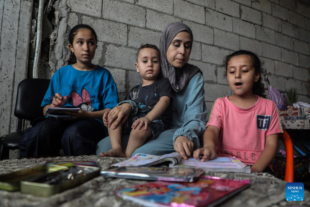 Palestinian woman Reham Said is seen with her children at a temporary shelter in Gaza City, on Aug. 13, 2025. (Photo by Rizek Abdeljawad/Xinhua)