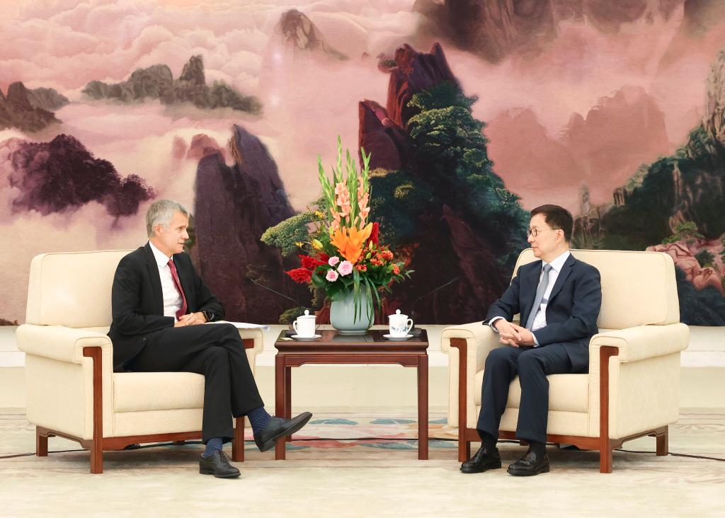 Chinese Vice President Han Zheng meets with Helge Lund, chair of the board of directors of Novo Nordisk, in Beijing, capital of China, Aug. 20, 2025. (Xinhua/Pang Xinglei)