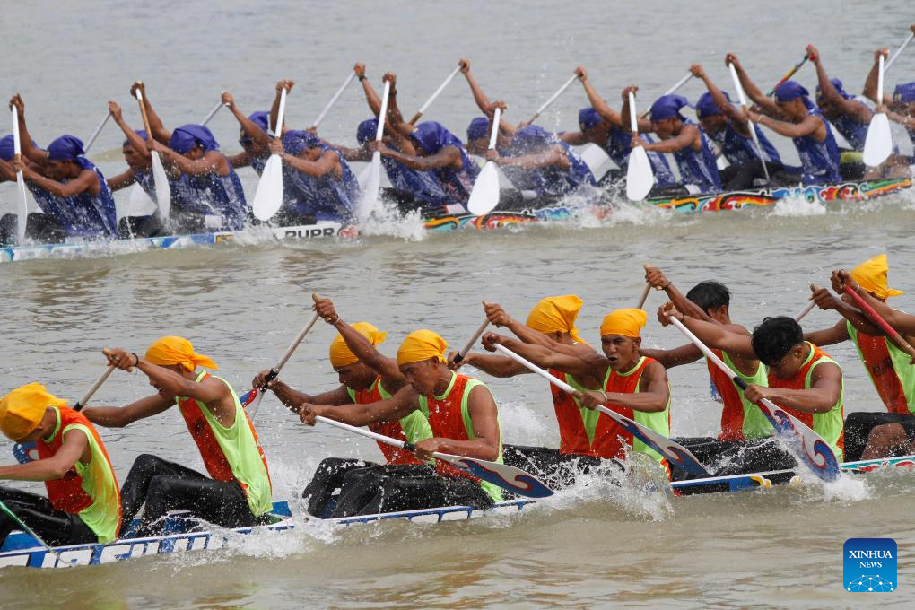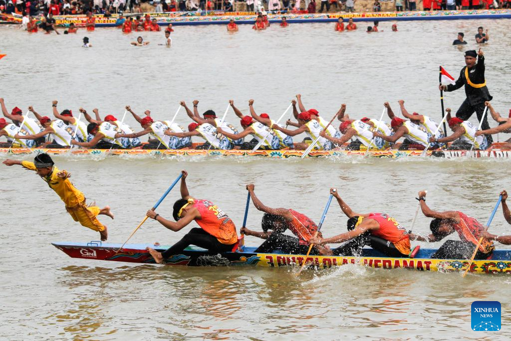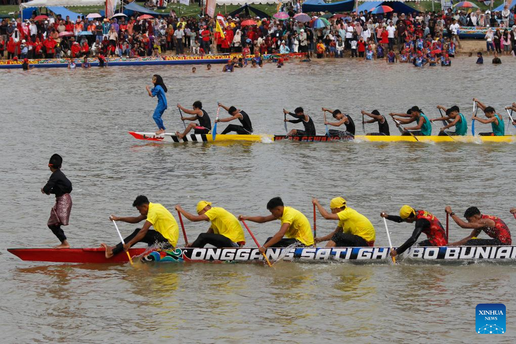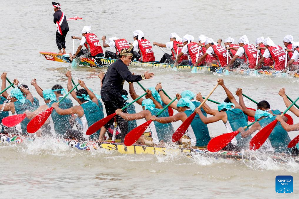People participate in a traditional long boat race or well known as Pacu Jalur during Pacu Jalur Festival at kuantan Batang river in Kuantan Singingi Regency, Riau Province, Indonesia, on Aug. 20, 2025. (Photo by Hadly Vavaldi/Xinhua)