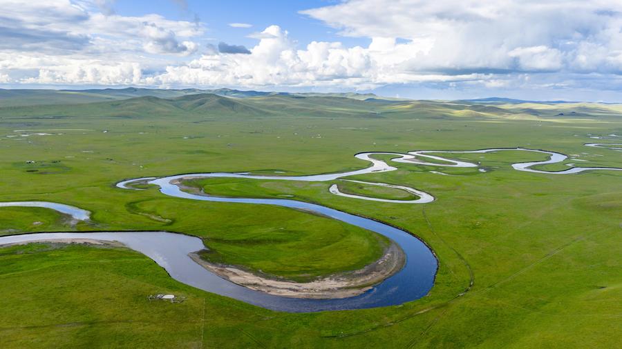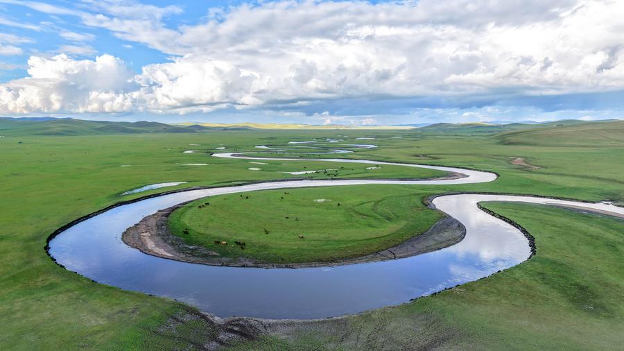HULUN BUIR, Aug. 20 (Xinhua) -- In early autumn, the Mergel Gol River in Hulun Buir, north China's Inner Mongolia Autonomous Region, flows gently amid the wide-open grasslands. Cattle, sheep and horses graze and wander freely along its banks, blending into a scene of quiet beauty.